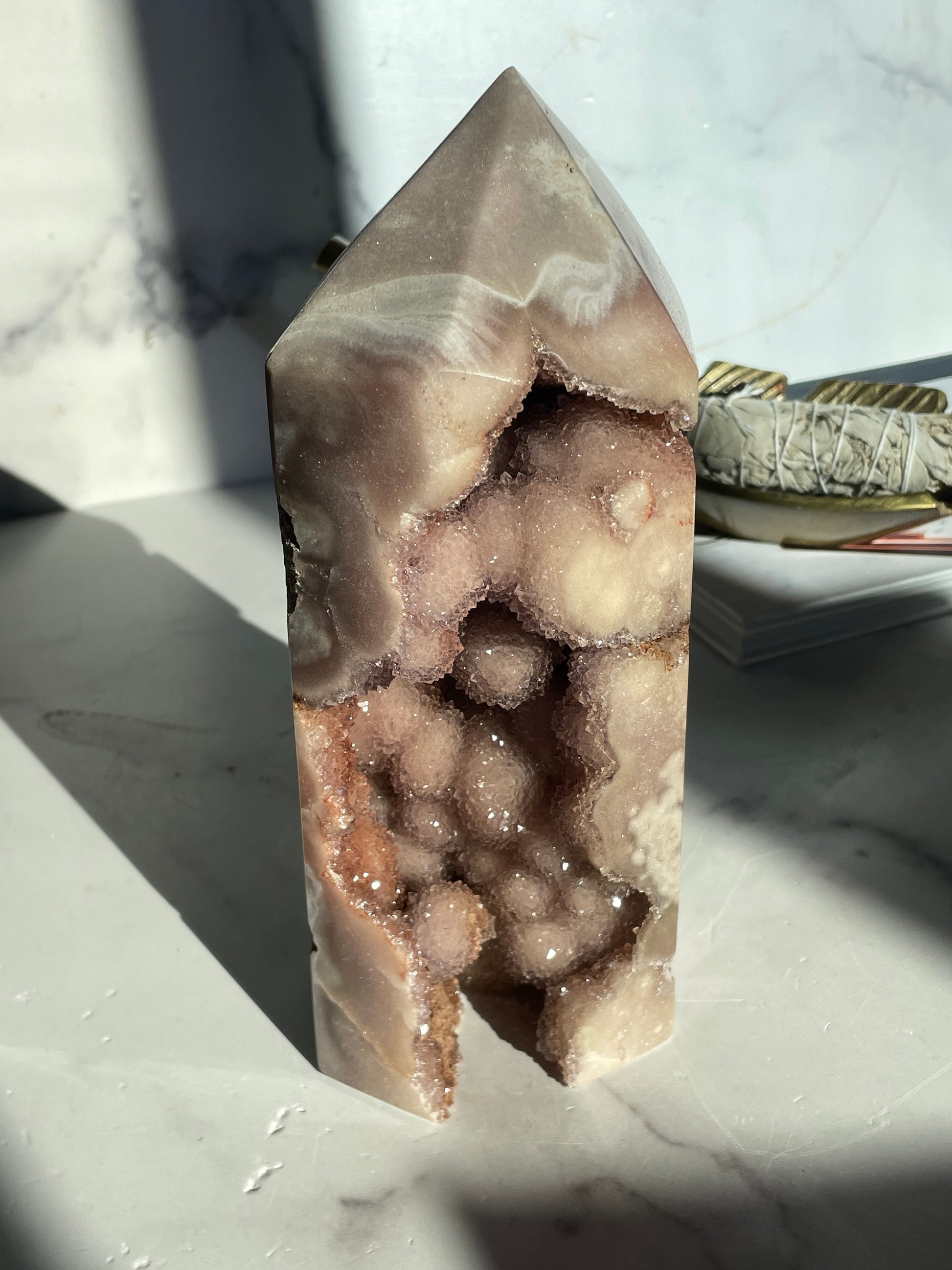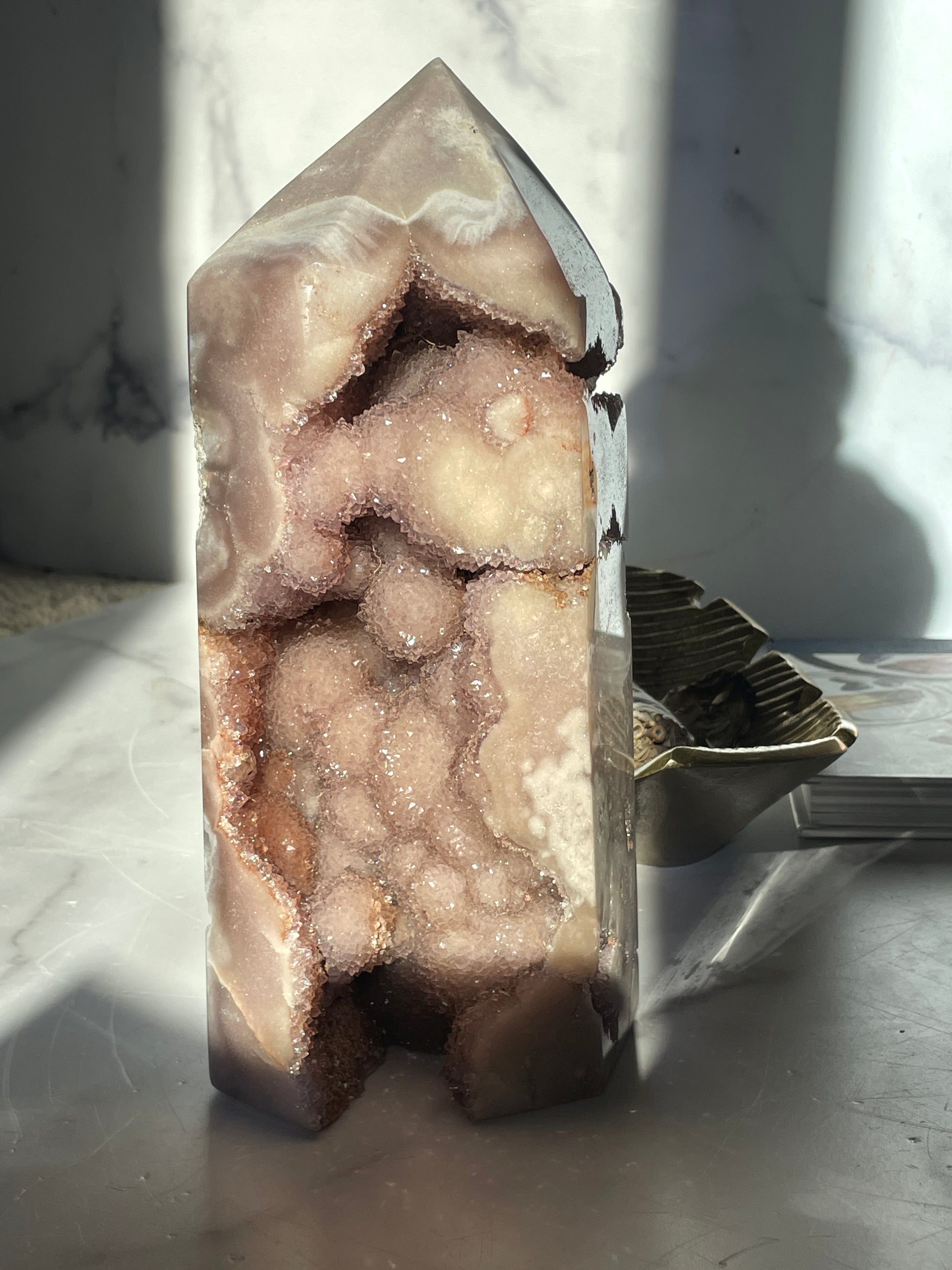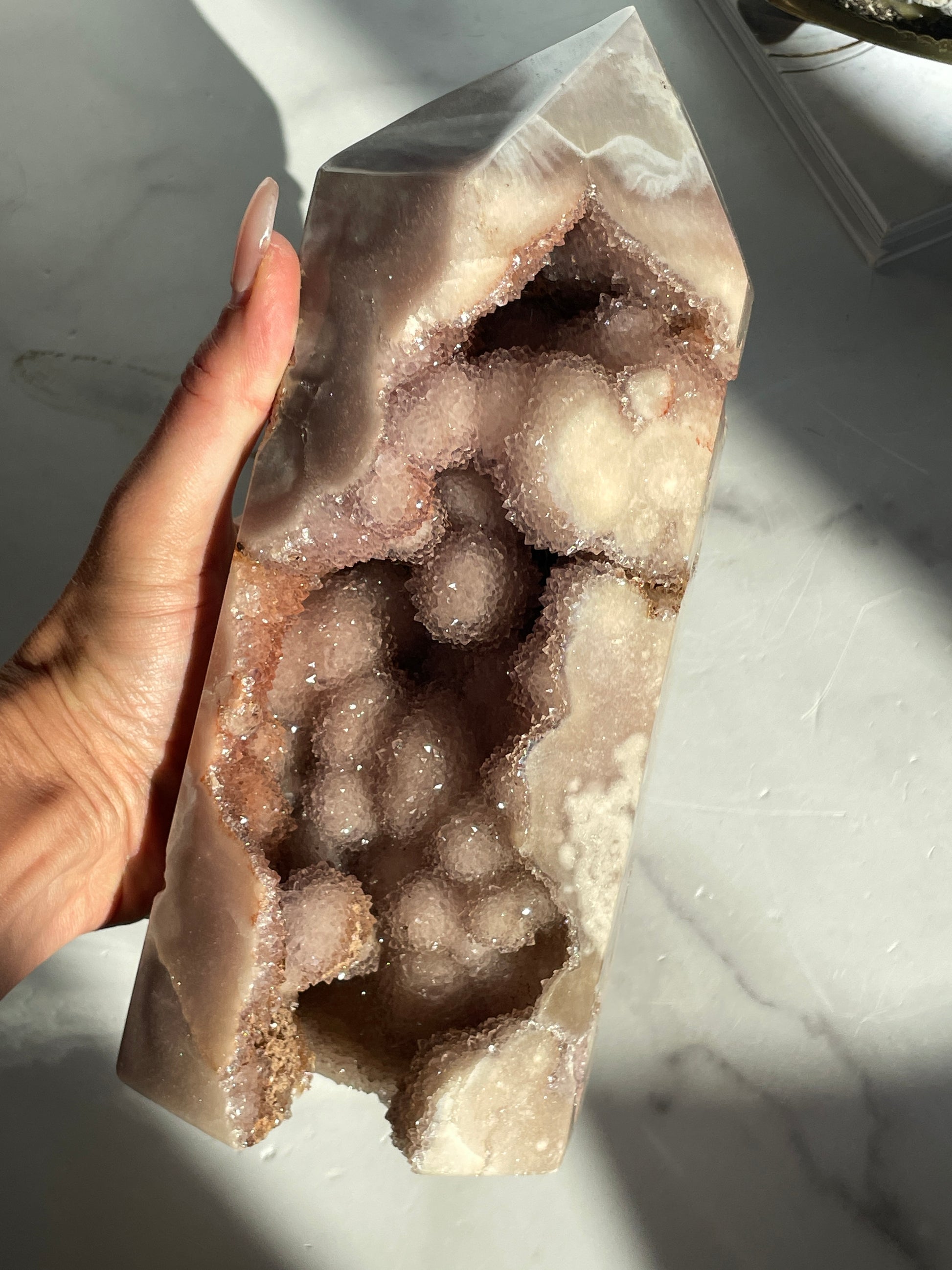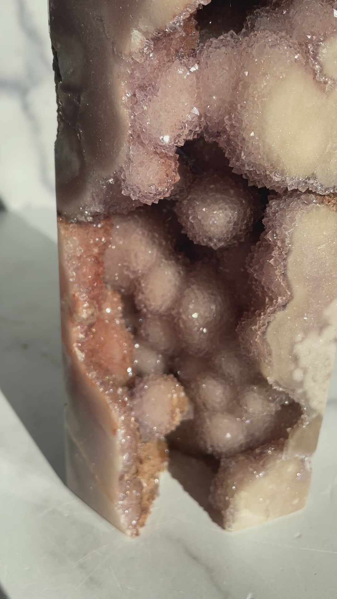Big Daddy was sourced a couple years ago... this piece was taken OFF the market for about a year and we are now RE-RELEASING this piece. Arguably... the most LUXURIOUS pink quartz/amethyst specimen we've ever had in our inventory... this piece is just WOW. Beautifully feathered/banded, cavernous and beautiful botryoidal (*bubbles) formations this MOODY beauty is ready to be adopted. Weighing over 6 lbs, measuring 10" x 4" at the base. This is a once in a lifetime piece.