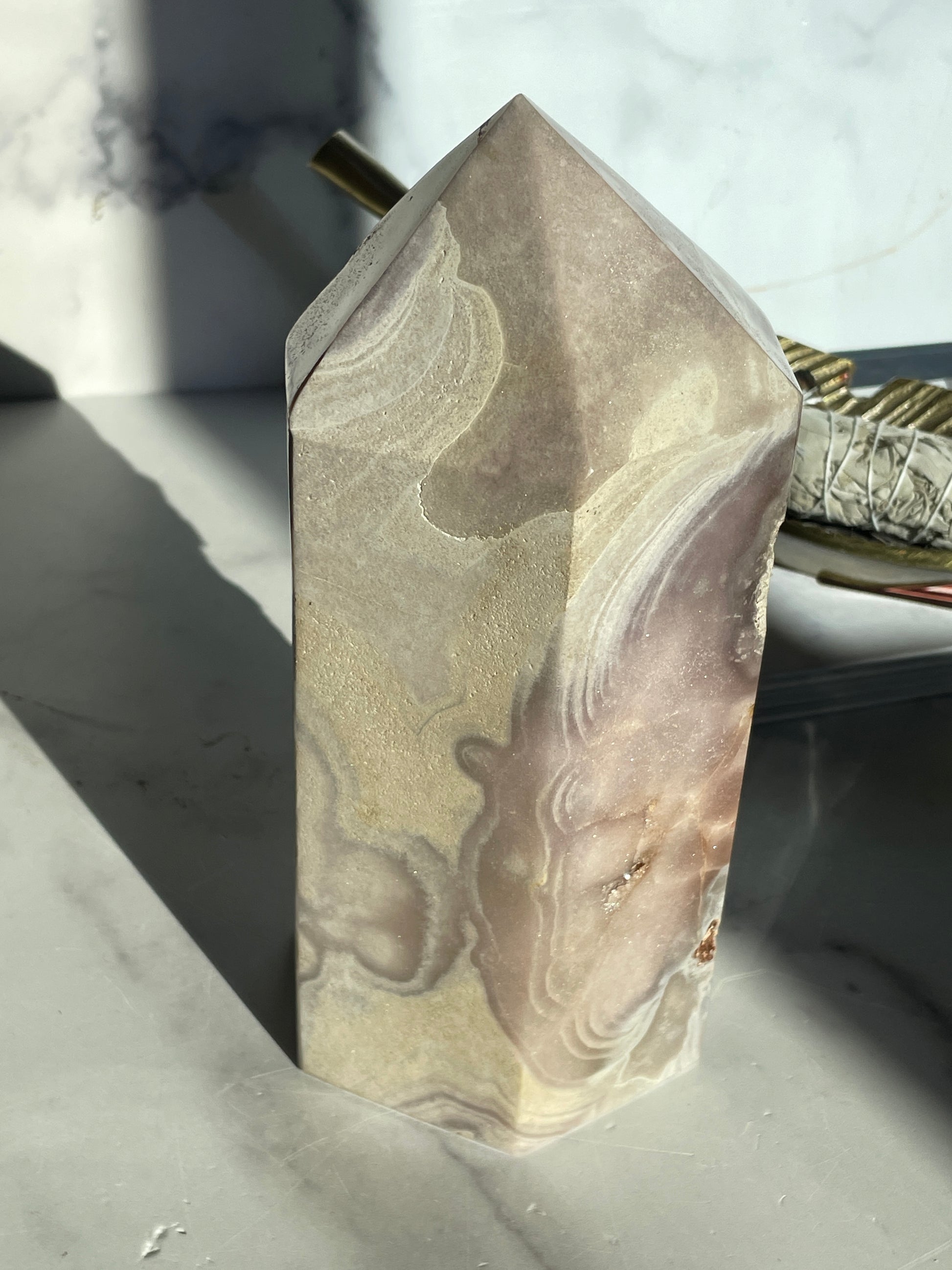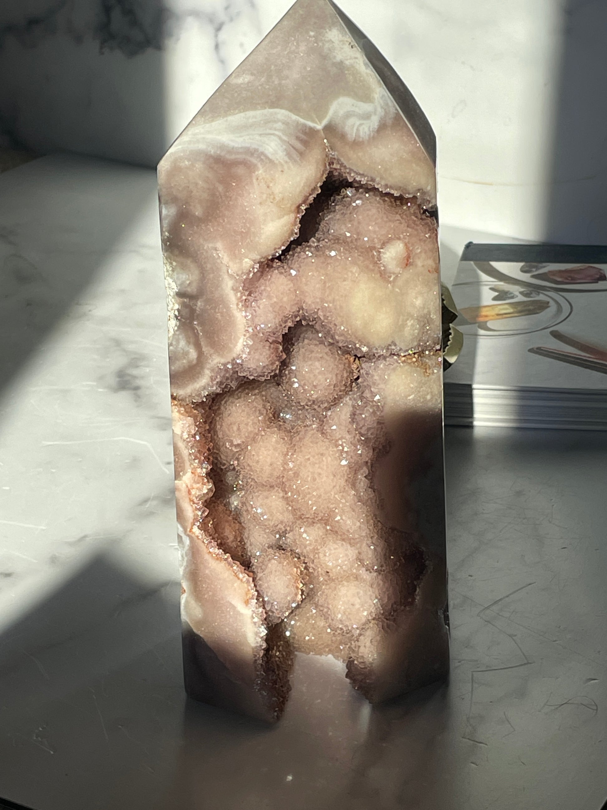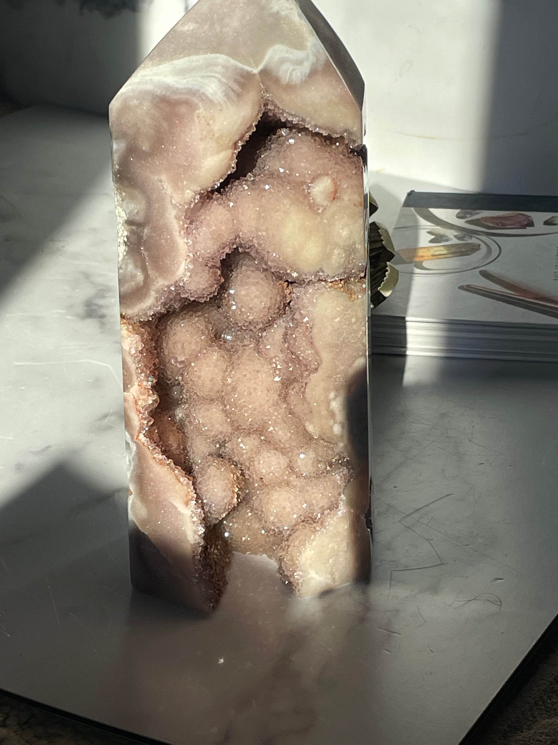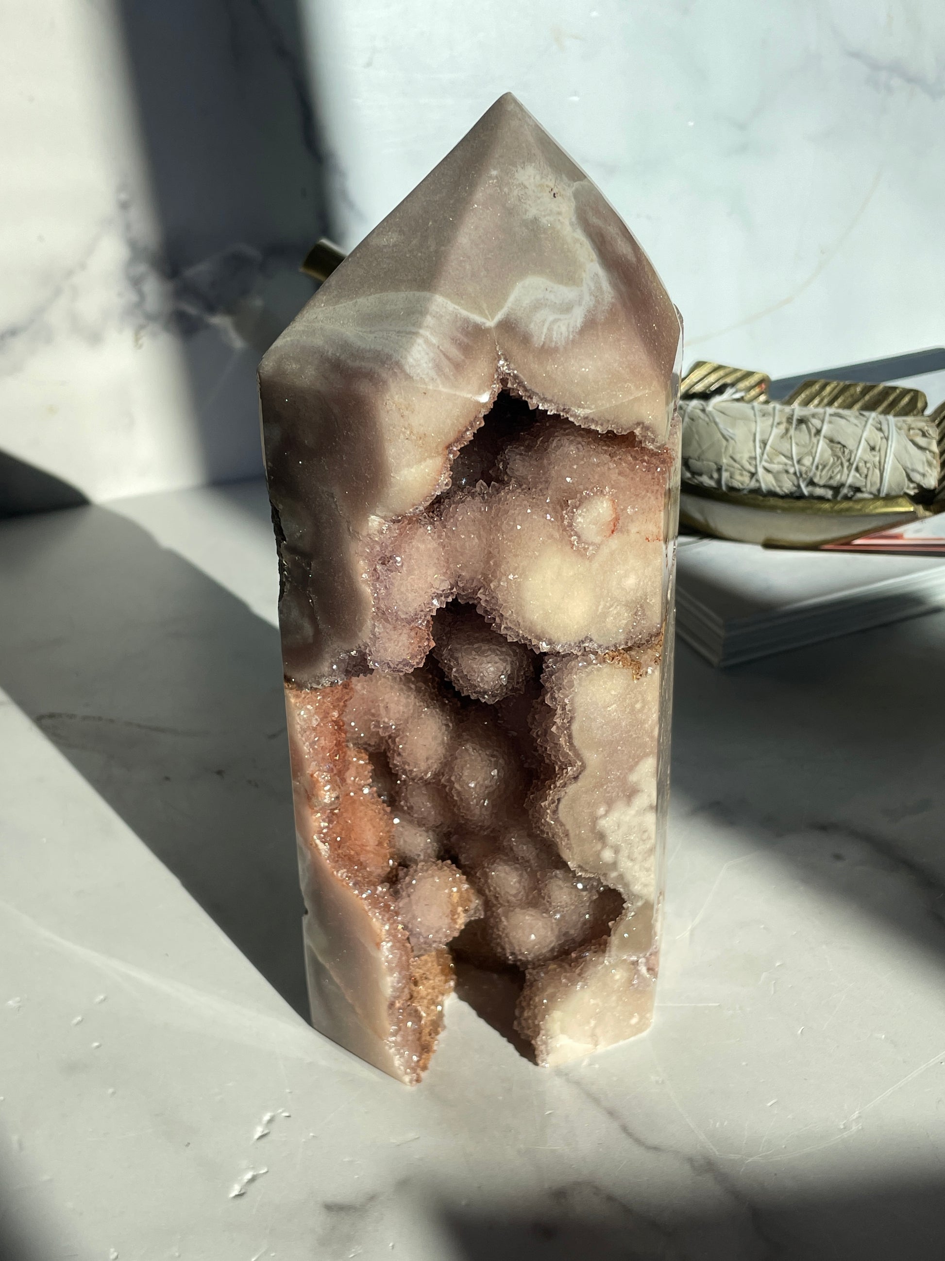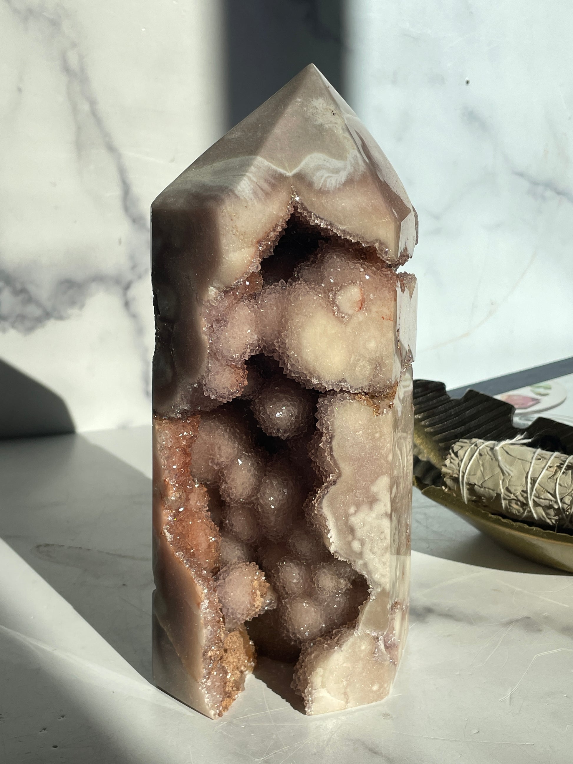 Big Daddy was sourced a couple years ago... this piece was taken OFF the market for about a year and we are now RE-RELEASING this piece. Arguably... the most LUXURIOUS pink quartz/amethyst specimen we've ever had in our inventory... this piece is just WOW. Beautifully feathered/banded, cavernous and beautiful botryoidal (*bubbles) formations this MOODY beauty is ready to be adopted. Weighing over 6 lbs, measuring 10" x 4" at the base. This is a once in a lifetime piece.