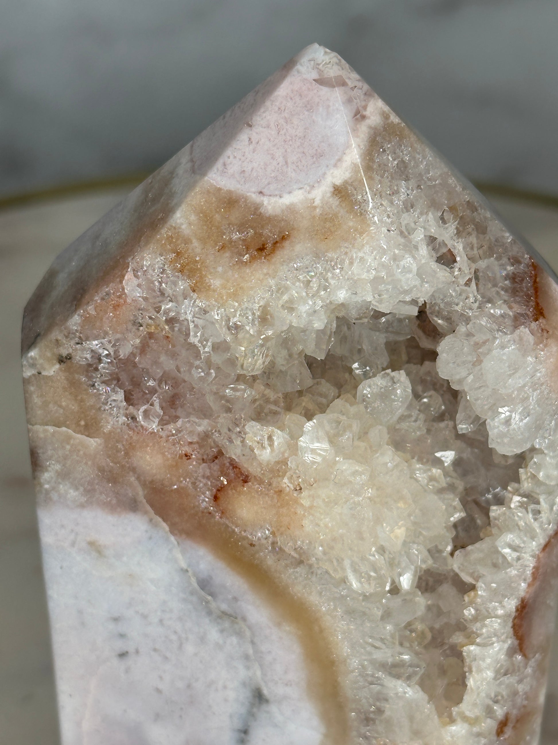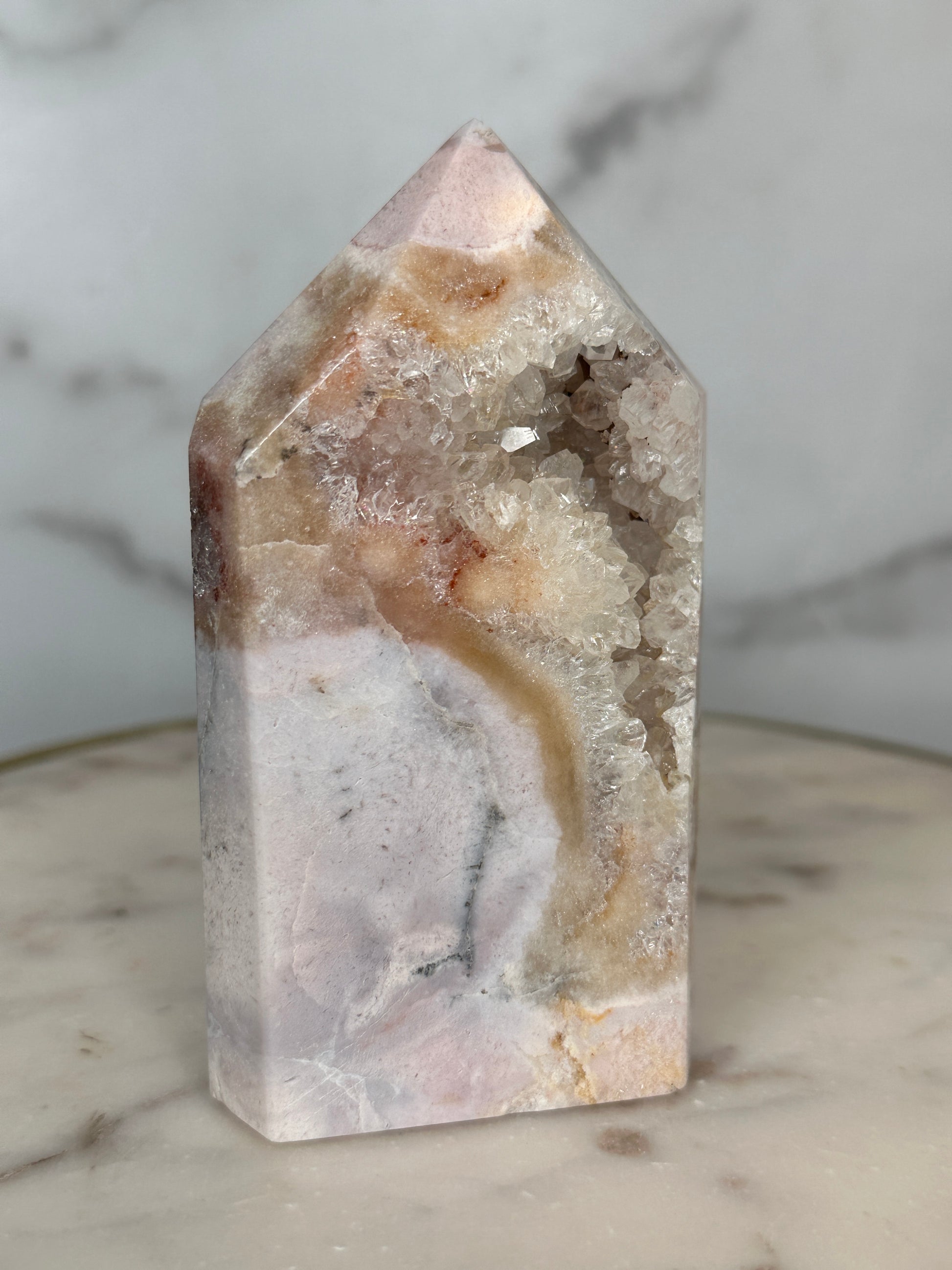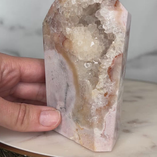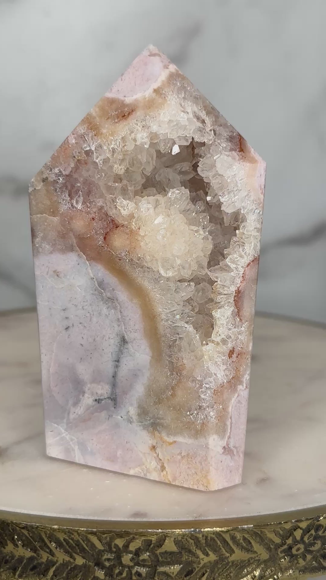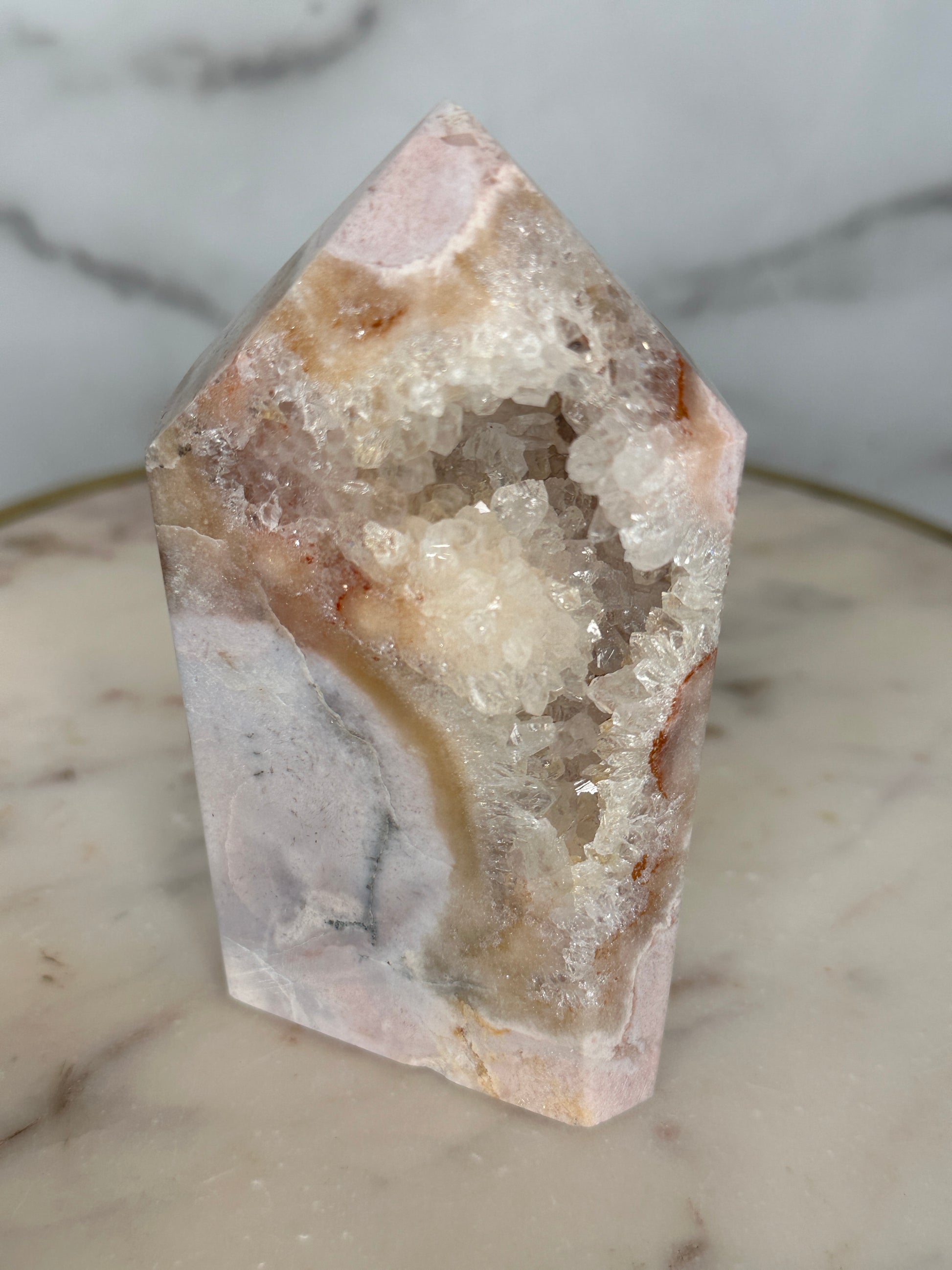 With its exceptional mosaic patterning and luminous drusy window, this piece feels like a cathedral carved by time. The intricate layers mirror the emotional strata we carry — memories, lessons, strength.
