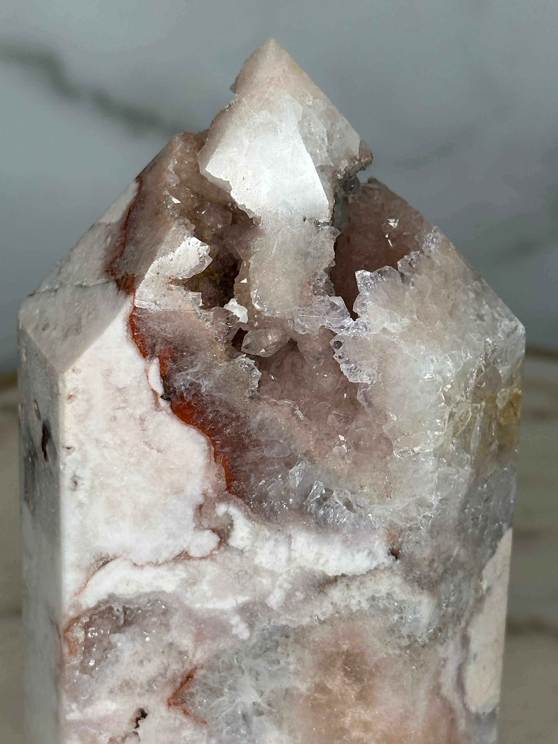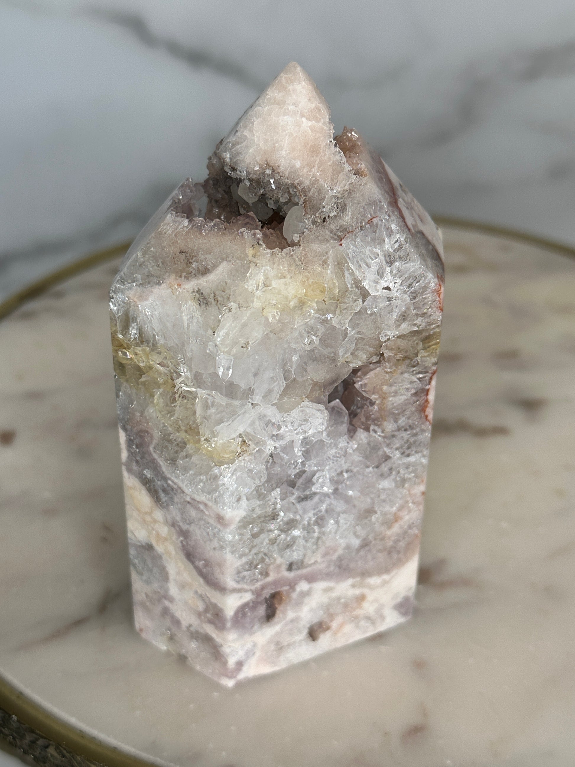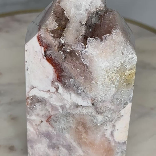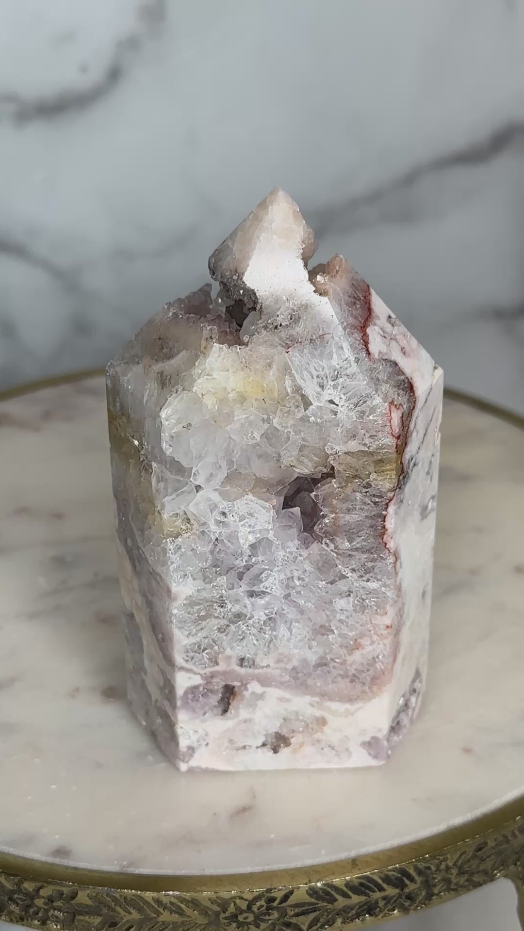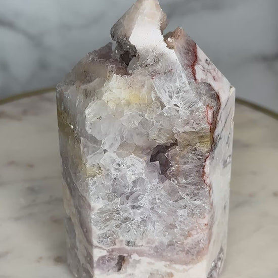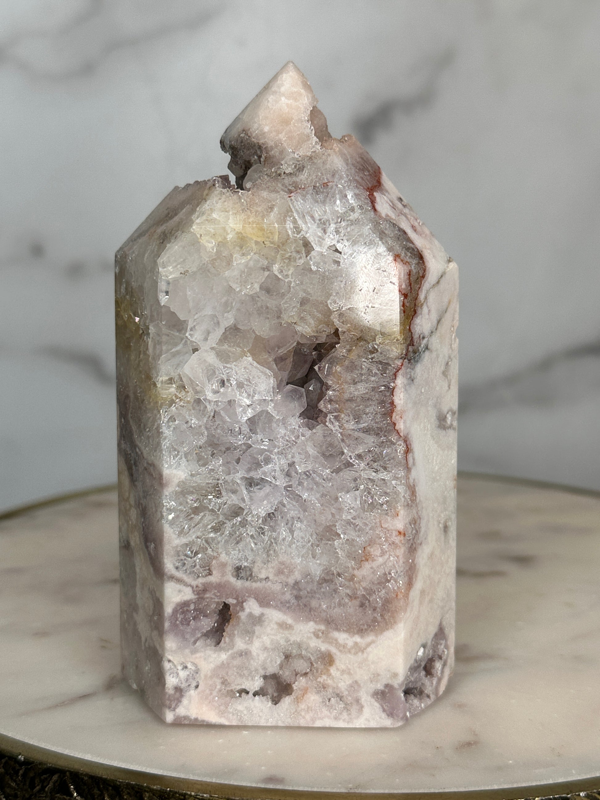 A close relative of the 'Marbled Mosaic' tower - this piece is 'cut from the same cloth' and batch with a similar stature, size and aesthetic, this piece fits perfectly within the Mosaic Collection, but with greater quartzation and tones of rose, blush, lilacand silver. This beautifully marbled pink quartz tower carries a quartzation chamber at its center — with lilac piping and druzy channels toward the top. Veins of deep rose and red trace through its body like a story written long ago but only now ready to be spoken. This piece resonates with the energy of unveiling — supporting its keeper in sharing what has been held, honoring their history, and reclaiming their voice with softness and strength.