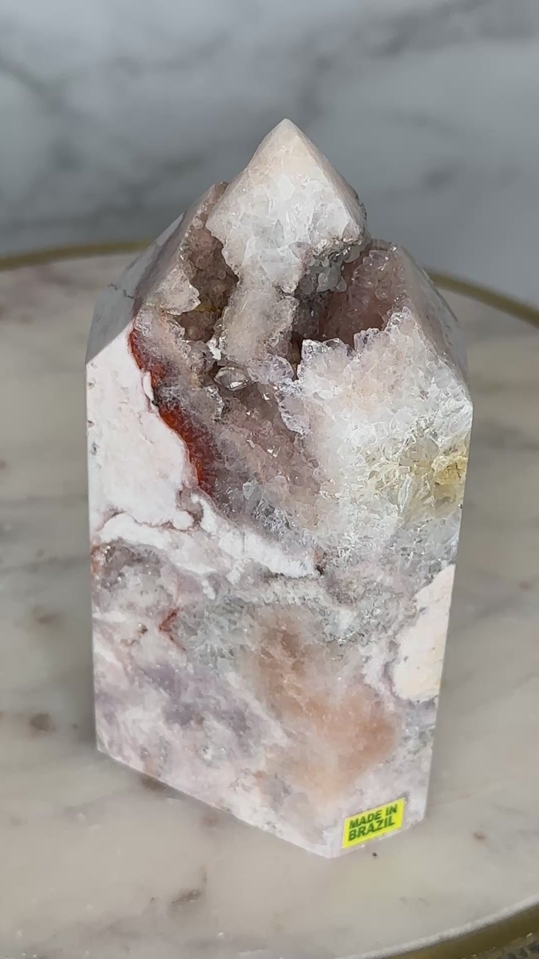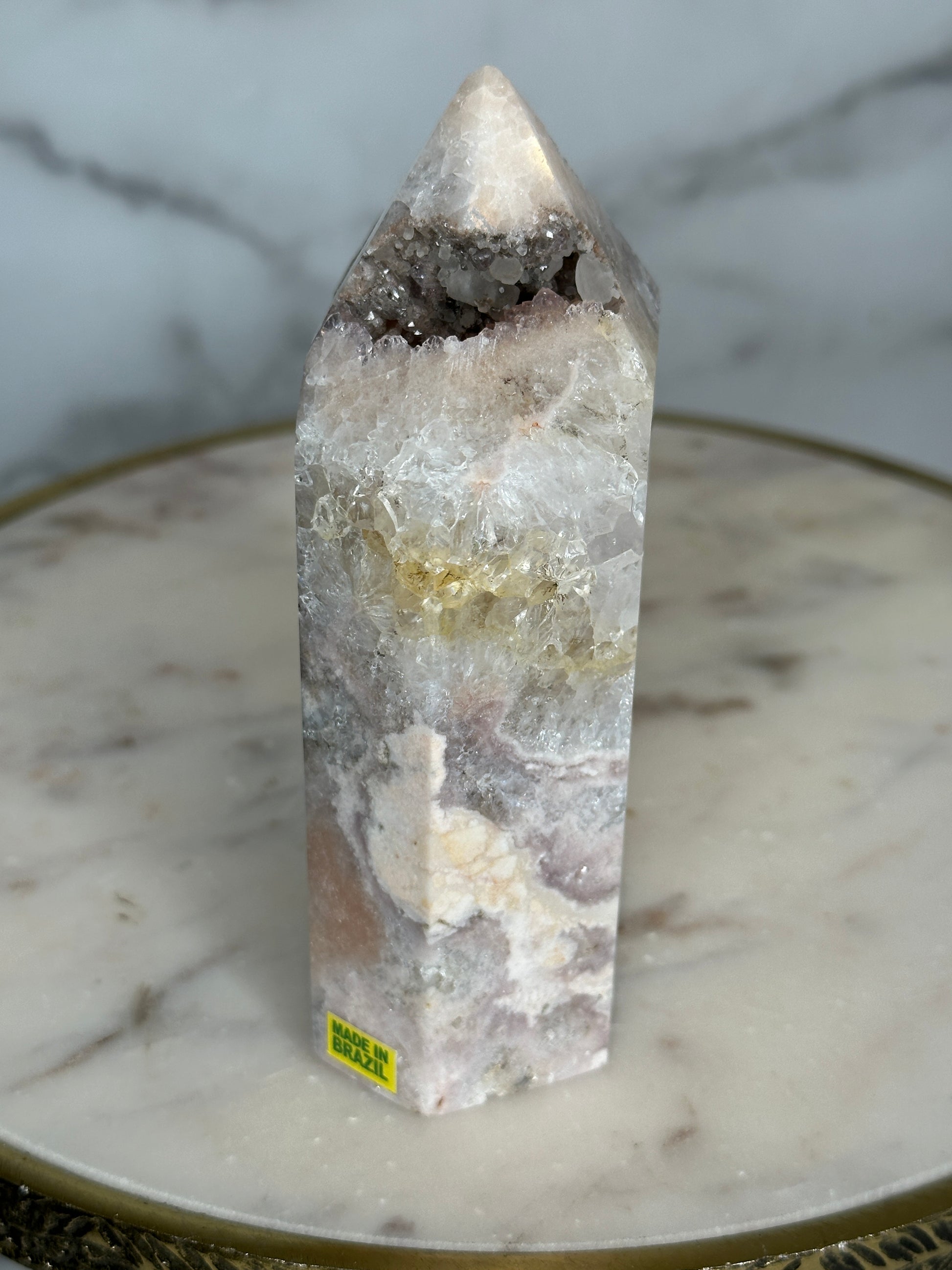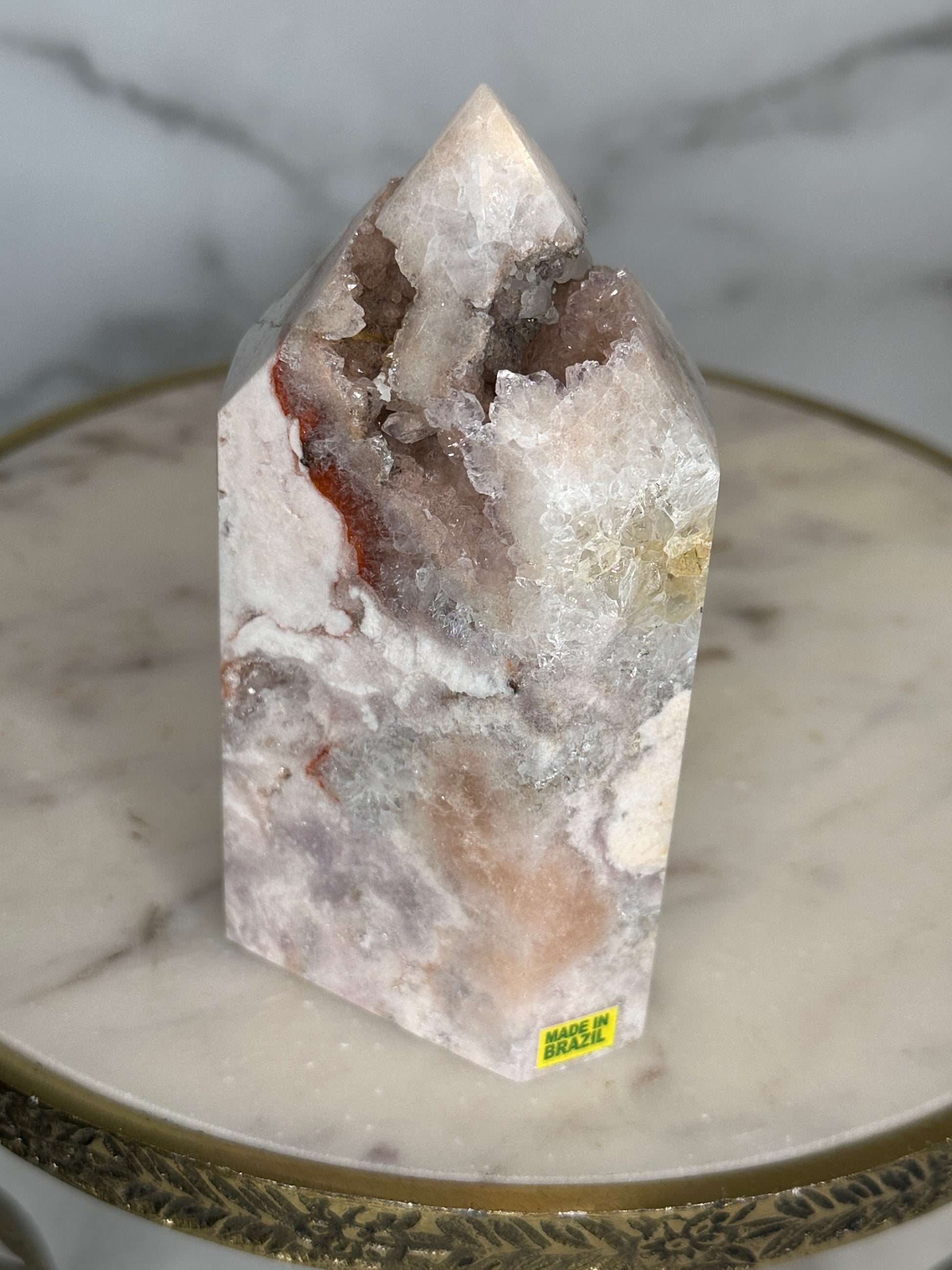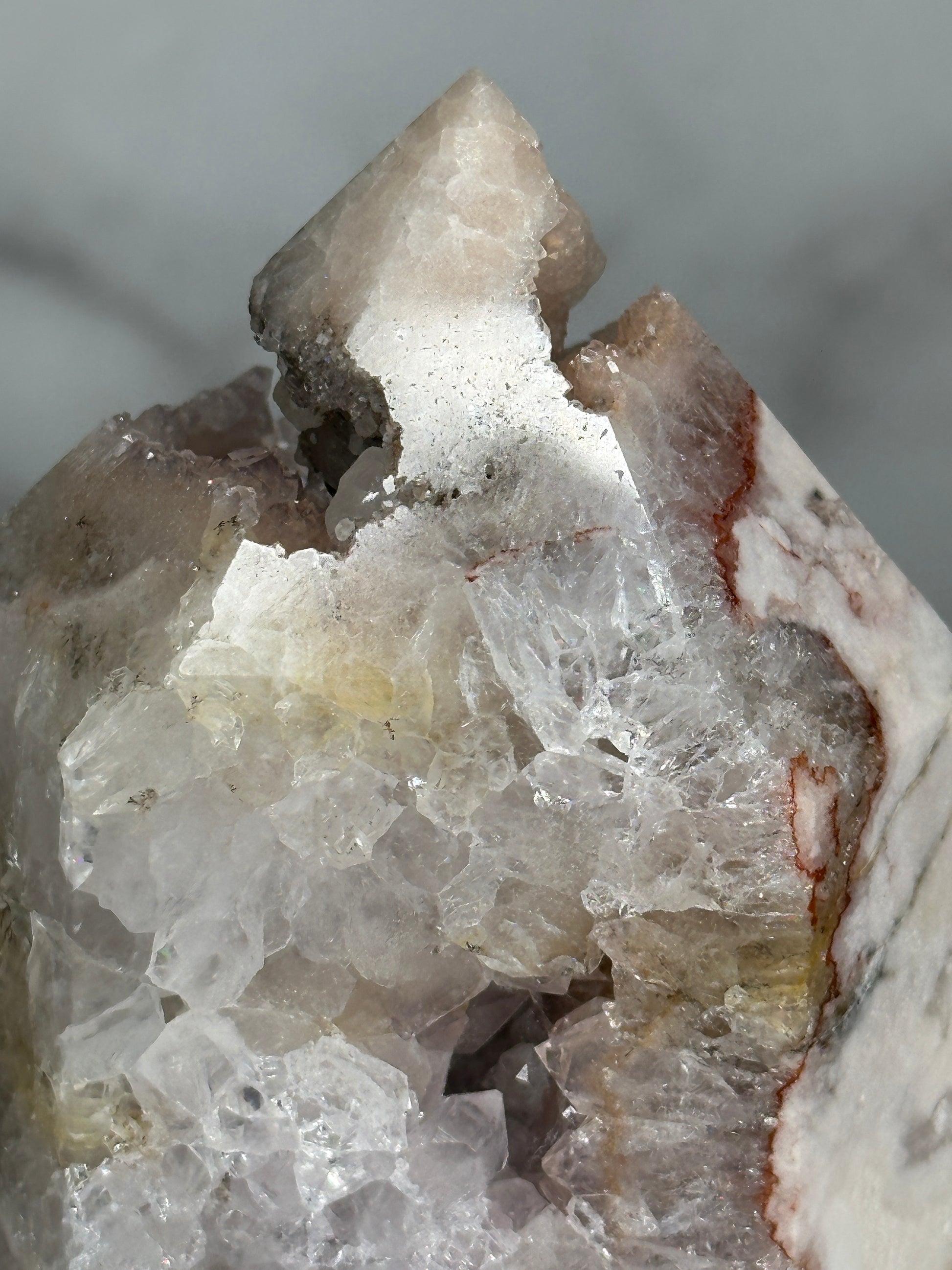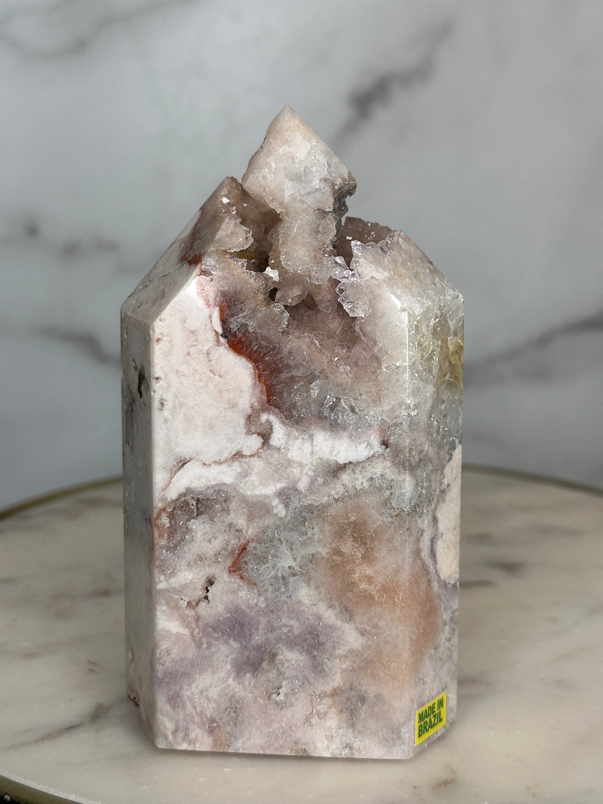 A close relative of the 'Marbled Mosaic' tower - this piece is 'cut from the same cloth' and batch with a similar stature, size and aesthetic, this piece fits perfectly within the Mosaic Collection, but with greater quartzation and tones of rose, blush, lilacand silver. This beautifully marbled pink quartz tower carries a quartzation chamber at its center — with lilac piping and druzy channels toward the top. Veins of deep rose and red trace through its body like a story written long ago but only now ready to be spoken. This piece resonates with the energy of unveiling — supporting its keeper in sharing what has been held, honoring their history, and reclaiming their voice with softness and strength.