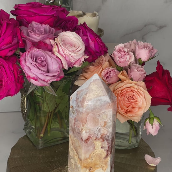 Measuring 6.5" T X 2.5" W and weighting 1 lb 12 oz, this beauty is packed with PA perfection. Lilacs, reds, pinks and golden tones. At the bottom of this piece there is some rough material where the matrix was kept within the piece - this offers more texture and contrast against the beautifully polished material